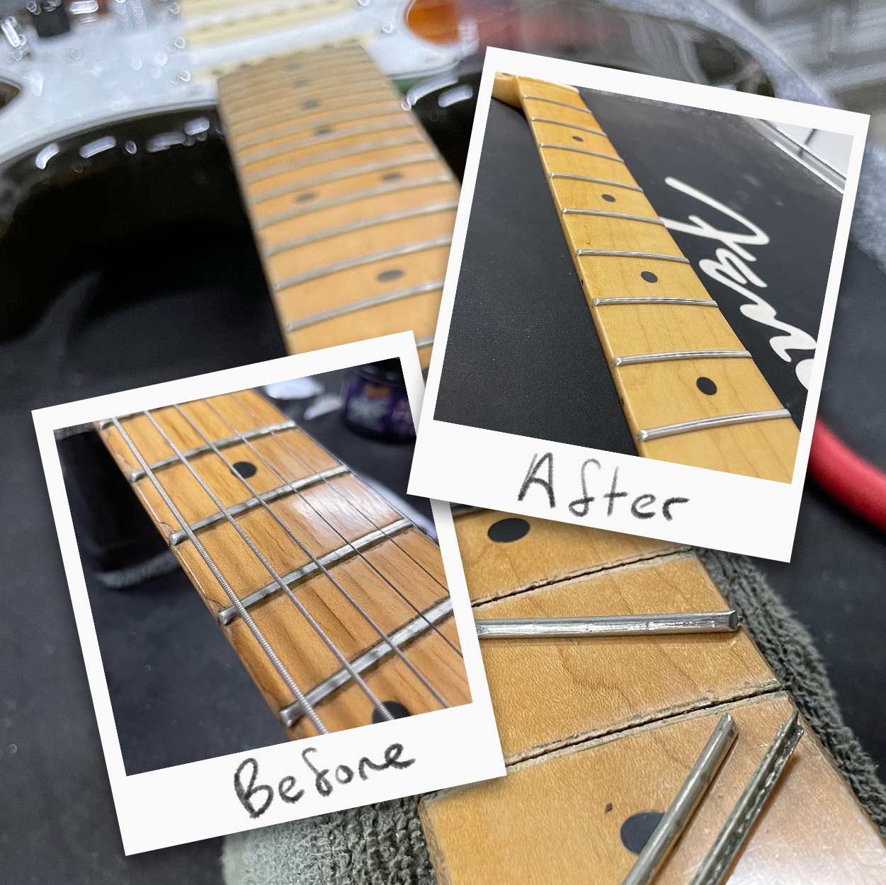 When I first took my treasured '97 Strat to Rob, correct intonation was impossible to acheive. The frets were worn wedges way beyond dressing, the board was warped, and the finish was worn to wood all along the edges. It was a nightmare to play. After a full Refret, a run through the PLEK and a lot of love from Rob, it is a totally different instrument. The board radius is perfect, the new bone nut is perfect, the oversized frets are perfect, and the "Nicotine Burst" lacquer job is stunning.