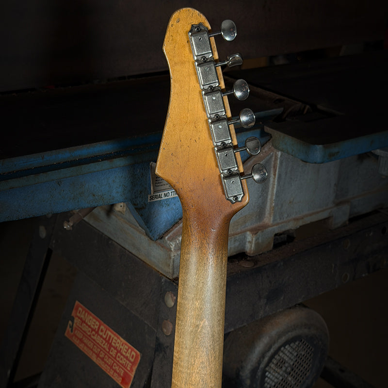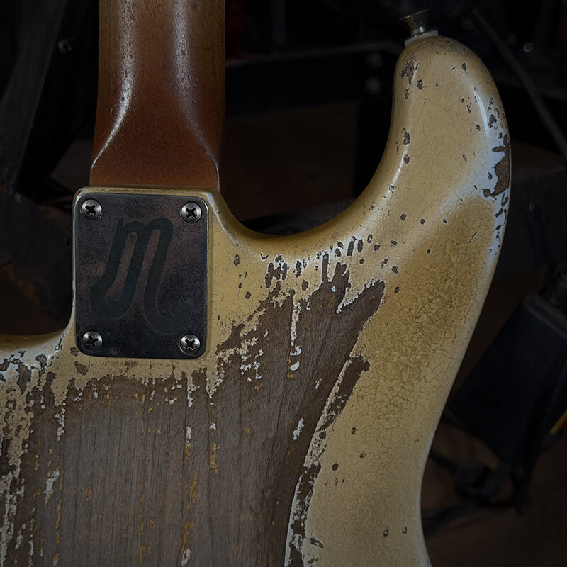Every Mestric Guitar is finished in nitrocellulose lacquer and heavily aged to evoke decades of real‑world playing—sweat, smoke‑filled rooms, knocks, wear, and the natural grime that builds up over a lifetime. The finish is cracked, worn, and authentically played‑in, not only looking old but feeling like an instrument that has been loved for 60–70 years.